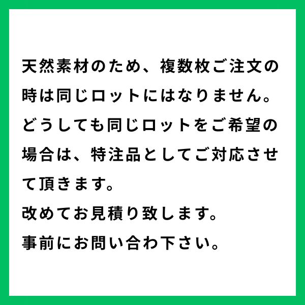 天然素材のため、複数枚ご注文の時は同じロットにはなりません。どうしても同じロットをご希望の場合は、特注品としてご対応させて頂きます。 改めてお見積り致します。事前にお問い合わ下さい。